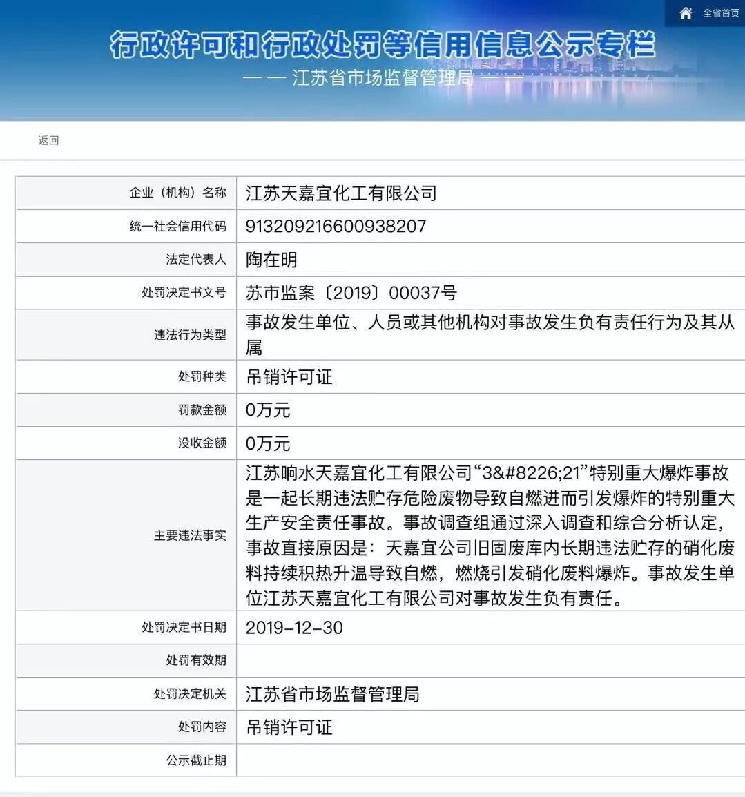 Jiangsu Xiangshui Tianjiayi Chemical Co., Ltd. licence tika atsaukta īpaši smaga sprādziena dēļ martā, kurā saskaņā ar administratīvā soda lēmumu tika nogalināti 78 cilvēki.